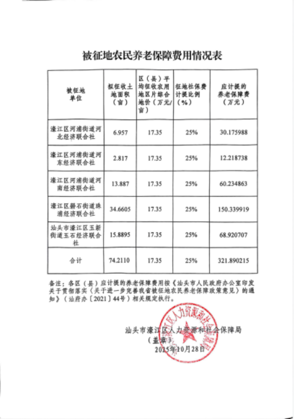 (三)社會保障費用。根據《廣東省人民政府辦公廳轉發省人力資源社會保障廳關于進一步完善我省被征地農民養老保障政策意見的通知》(粵府辦〔2021〕22號)、《汕頭市人民政府辦公室印發關于貫徹落實〈關于進一步完善我省被征地農民養老保障政策意見〉的通知》(汕府辦〔2021〕44號)規定,核定該項目按濠江區統一使用17.35萬元/畝的中心城區平均征收農用地區片綜合地價作為基數計提征地社保費,計提比例為25%的標準一次性計提被征地農民養老保障資金存入“收繳被征地農民養老保障資金過渡戶”,費用合計321.890213萬元,專款用于被征地農民繳納養老保險費用。