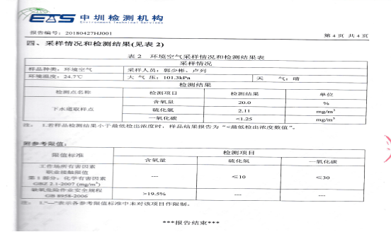 事故調(diào)查組委托第三方中介服務機構(gòu)(深圳市中圳檢測技術(shù)有限公司)對事故現(xiàn)場窨井下水道底環(huán)境空氣進行檢測(見圖7),檢測結(jié)果顯示環(huán)境溫度為24.7°C,大氣壓為101.3kpa,空氣含氧量20%,硫化氫2.11㎎/m3,一氧化碳<1.25㎎/m3,檢測結(jié)果均未超出國家環(huán)境保護總局(2013年)《空氣和廢氣監(jiān)測分析方法》的限值范圍。