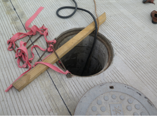 事故地點位于濠江區(qū)南山灣園區(qū)內(nèi)珠河路與經(jīng)四路(即南興路與慧業(yè)路)交界處,屬市政道路城市污水管道,出事窨井編號為W25。16日上午10時39分左右,在勘察事故現(xiàn)場時,現(xiàn)場周邊放置1臺正在運轉(zhuǎn)的空壓機,空壓機旁2條空壓機管分別伸入窨井里(其中一條為氧氣輸送帶,另一條氣壓帶),事發(fā)時窨井口懸掛1張軟梯,用一根長方形木條橫穿在窨井上方口中央處,便于作業(yè)人員進入窨井里作業(yè),旁邊散落著紅色的編織安全帶(見圖1-2);事發(fā)后,為防止衍生事故發(fā)生,事故現(xiàn)場采用安全錐(安全警示標志)、警戒帶進行圍閉,出事的污水窨井井蓋已經(jīng)重新復位,現(xiàn)場設(shè)有1人值守(見圖3)。