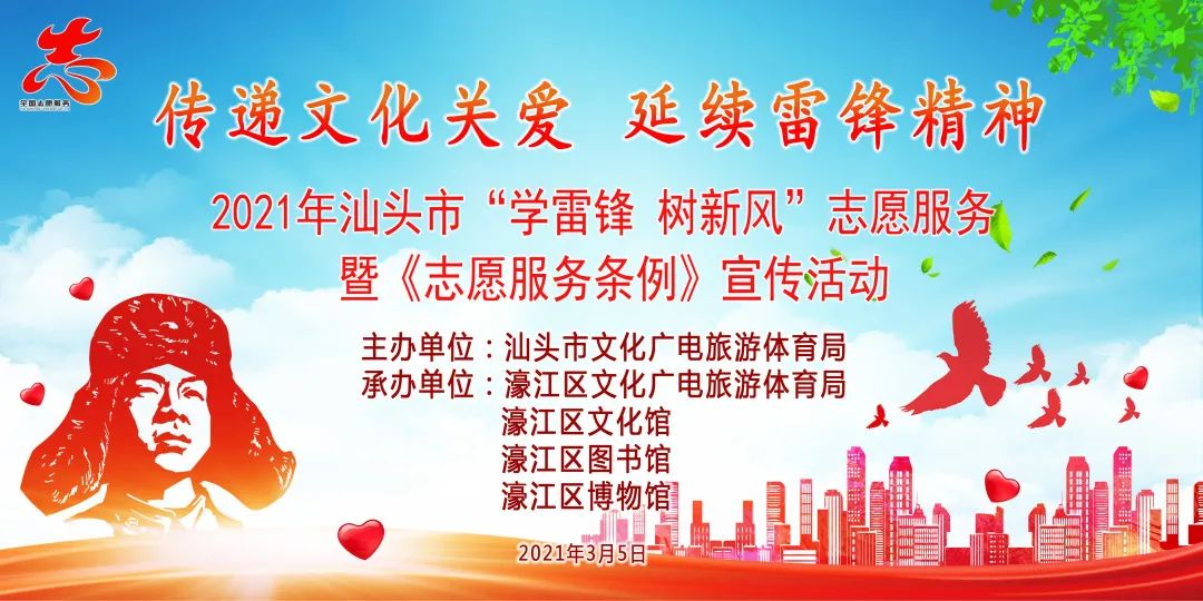 3月5日是我國第58個“學雷鋒紀念日”,為深入貫徹落實中宣部、中央文明辦等部門《關于公共文化設施開展學雷鋒志愿服務的實施意見》,大力弘揚“奉獻、友愛、互助、進步”的志愿精神,推進公共文化設施學雷鋒志愿服務,發揮文化引領示范作用,積極培育和踐行社會主義核心價值觀,助力全國文明城市創建工作。從今日起,濠江區文化館、濠江區圖書館和濠江區博物館聯合開展2021年汕頭市“學雷鋒 樹新風”志愿服務活動暨《志愿服務條例》宣傳活動。