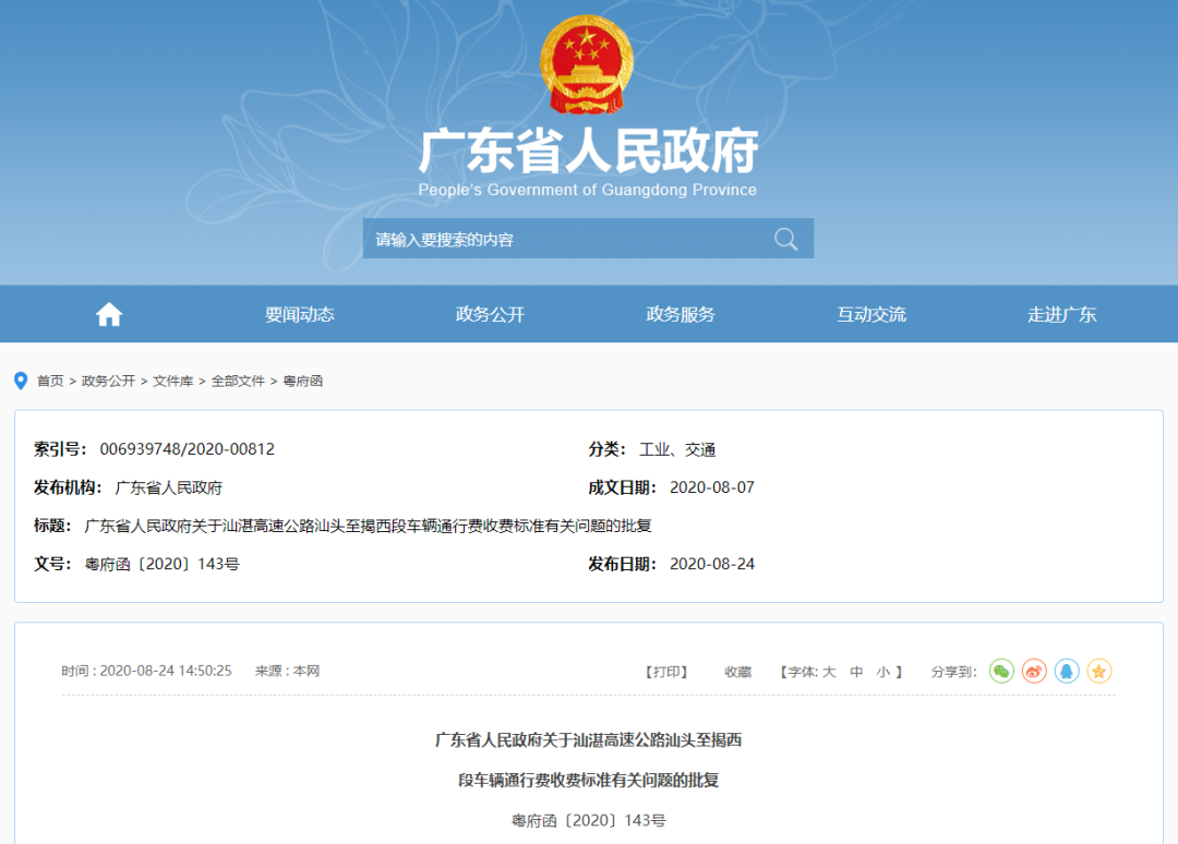 近日,省人民政府公布《關于汕湛高速公路汕頭至揭西段車輛通行費收費標準有關問題的批復》。