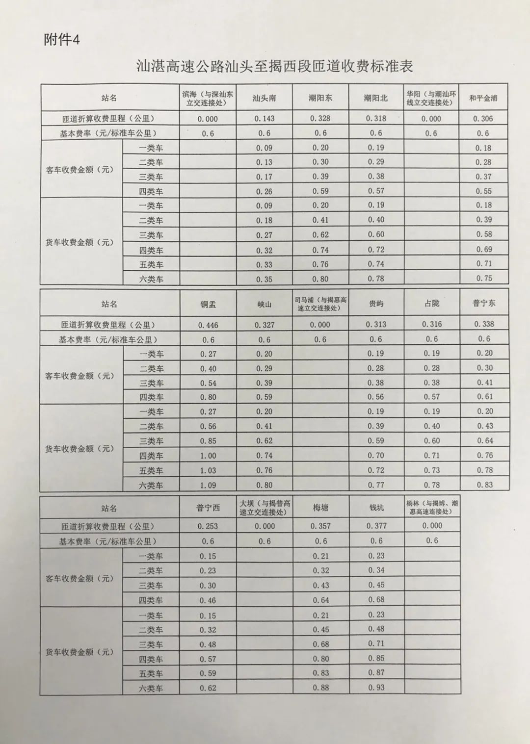 省人民政府同意汕湛高速公路汕頭至揭西段交工驗收通車和收費設施經驗收符合聯網收費技術要求后開始收費,收費車型執行《收費公路車輛通行費車型分類》(JT/T489-2019),收費費率為0.6元/標準車公里,1至4類客車的收費系數分別為1、1.5、2、3,1至6類貨車的收費系數分別為1、2.1、3.16、3.75、3.86、4.09,專項作業車的收費標準參照貨車執行。