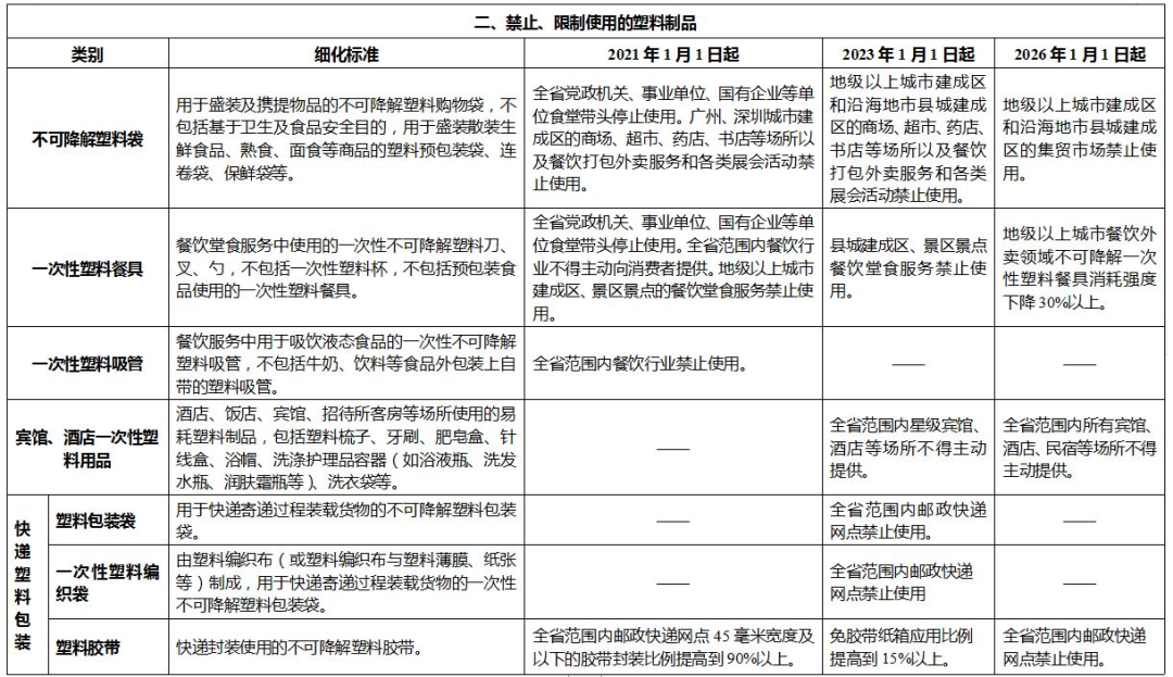 為便于各地執(zhí)行《省實施意見》,省發(fā)展改革委、省生態(tài)環(huán)境廳制定了《廣東省禁止、限制生產(chǎn)、銷售和使用的塑料制品目錄(2020年版)》,明確了相關(guān)禁限細(xì)化標(biāo)準(zhǔn)、區(qū)域范圍和時間節(jié)點。