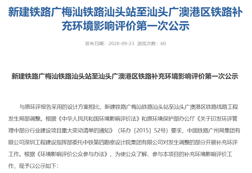 記者了解到,與原環(huán)評(píng)報(bào)告采用的設(shè)計(jì)方案相比,新建鐵路廣梅汕鐵路汕頭站至汕頭廣澳港區(qū)鐵路線路工程發(fā)生局部調(diào)整。根據(jù)《中華人民共和國(guó)環(huán)境影響評(píng)價(jià)法》和原環(huán)境保護(hù)部辦公廳《關(guān)于印發(fā)環(huán)評(píng)管理中部分行業(yè)建設(shè)項(xiàng)目重大變動(dòng)清單的通知》(環(huán)辦〔2015〕52號(hào))要求,中國(guó)鐵路廣州局集團(tuán)有限公司深圳工程建設(shè)指揮部委托中鐵第四勘察設(shè)計(jì)院集團(tuán)有限公司對(duì)發(fā)生調(diào)整的部分開(kāi)展補(bǔ)充環(huán)評(píng)工作。根據(jù)《環(huán)境影響評(píng)價(jià)公眾參與辦法》,為使公眾了解、參與本項(xiàng)目的補(bǔ)充環(huán)境影響評(píng)價(jià)工作,目前正在進(jìn)行公示。