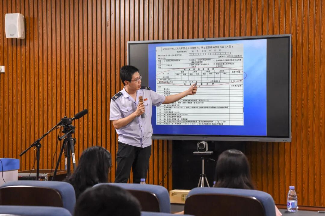 此次活動采用“線下現(xiàn)場宣講+線上釘釘平臺直播”的形式,邀請60多家企業(yè)代表參加收看。活動現(xiàn)場,來自濠江區(qū)稅務(wù)局的業(yè)務(wù)骨干首先向企業(yè)代表宣傳普及了民法典涉及稅務(wù)領(lǐng)域的相關(guān)知識,接著重點(diǎn)圍繞小型微利企業(yè)稅收優(yōu)惠政策和延長階段性減免企業(yè)社會保險費(fèi)政策實(shí)施期限等政策進(jìn)行講解。稅務(wù)干部通過案例分析、流程演示、關(guān)鍵點(diǎn)解讀、現(xiàn)場問答等方式,全方位展現(xiàn)政策內(nèi)容、適用對象、申報(bào)流程等,幫助企業(yè)進(jìn)一步懂政策、會操作。