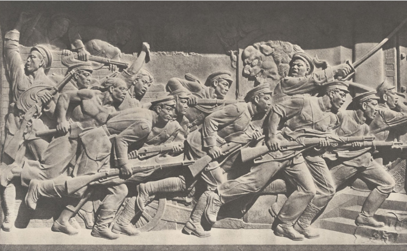 “武昌起義”是人民英雄紀(jì)念碑南面的一塊浮雕,描繪了1911年10月10日革命武裝軍人們攻打湖廣總督部堂這一辛亥革命爆發(fā)的標(biāo)志性時(shí)刻。畫(huà)面中的多數(shù)人物是著軍裝、戴軍帽、手握槍支的軍人,他們神情凝重,正在沖向一座腐朽沒(méi)落的清代建筑大門(mén)。如果仔細(xì)觀察畫(huà)面上的人物,不難發(fā)現(xiàn),其中有兩個(gè)人物形象十分特別,一個(gè)是手拿斧頭、赤裸著上身的農(nóng)民,一個(gè)是舉著棍棒、振臂高呼的女青年。他們和軍人們一起并肩戰(zhàn)斗,一起加入了革命隊(duì)伍,這正是時(shí)代進(jìn)步的表現(xiàn)。由于革命思想的傳播,勞動(dòng)人民和進(jìn)步女青年從封建的桎梏中解放出來(lái),參與革命斗爭(zhēng),創(chuàng)造革命歷史。在他們身后,左側(cè)的背景是殘破不堪的城墻,右側(cè)是一座正在被戰(zhàn)火焚毀的石獅,敞開(kāi)的清式建筑大門(mén)和掉落在臺(tái)階上的湖廣總督部堂的牌匾和一面龍旗,道明了辛亥革命結(jié)束封建統(tǒng)治的舊時(shí)代的成果。